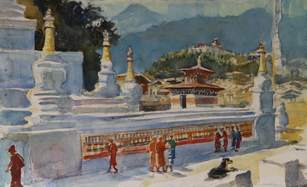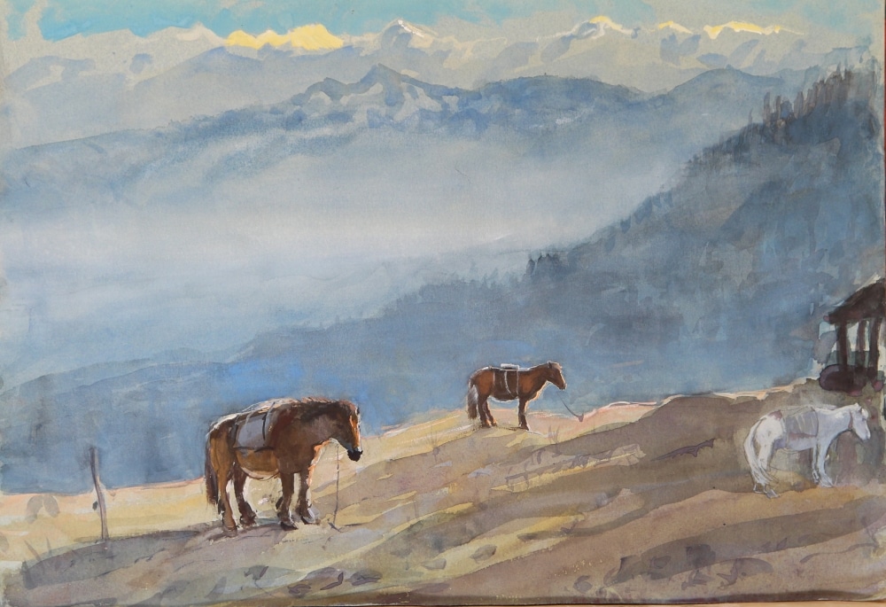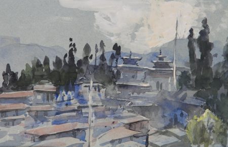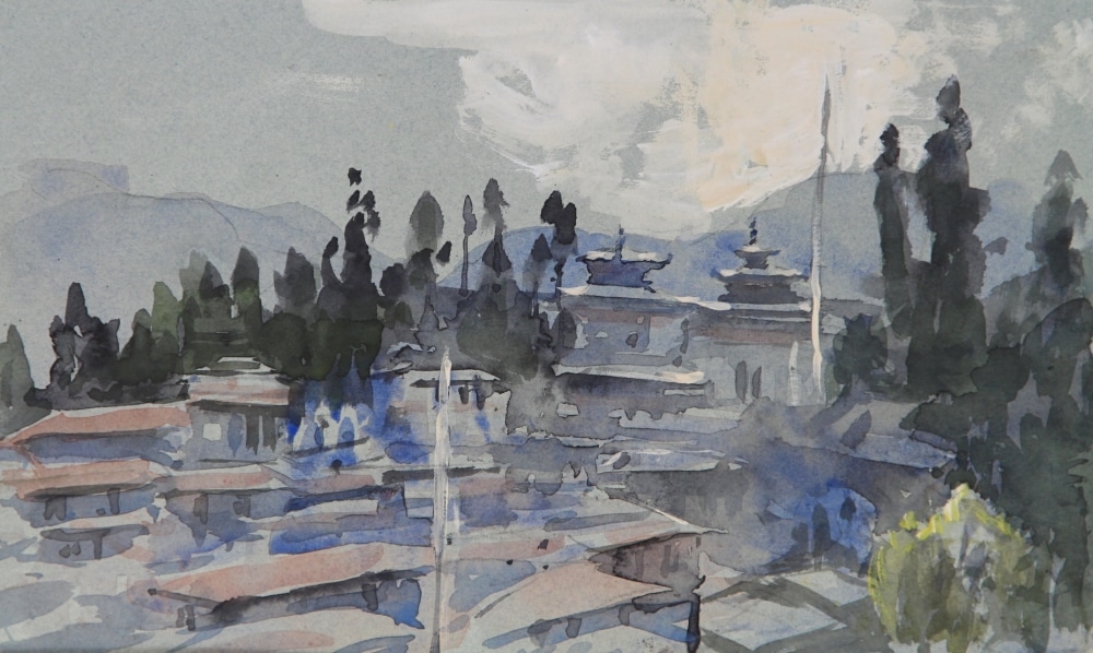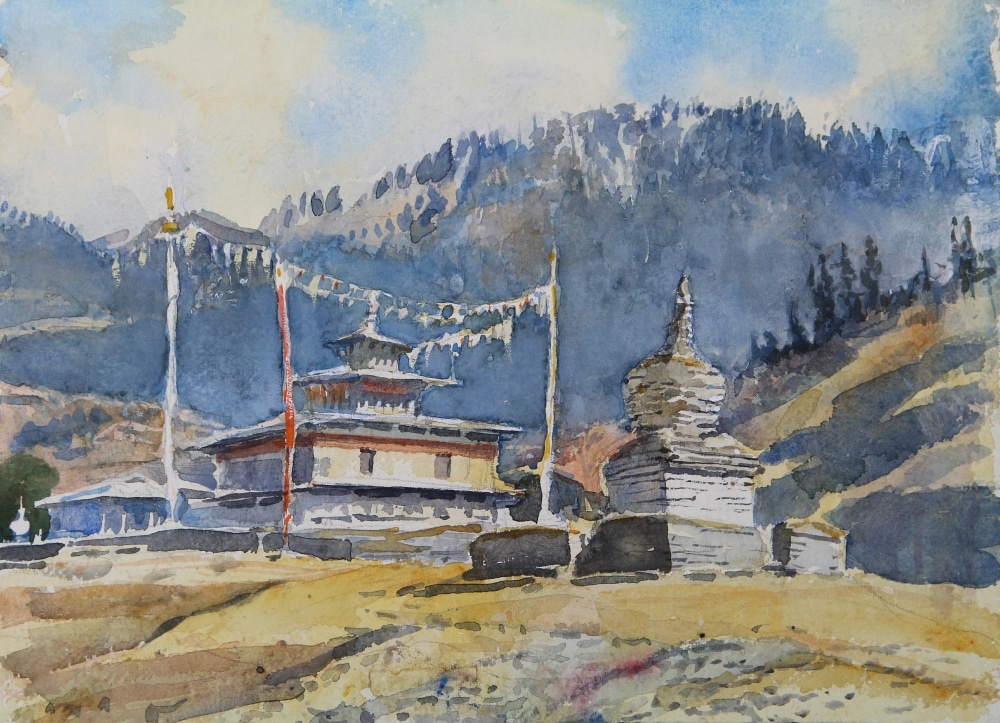 Tim Scott Bolton has made several expeditions to Bhutan and has grown to love the country on many levels. He and his wife took a group of fellow artists there last year and these pictures, in oil and watercolour are the result of his travels. At the end of the journey which started in Paro in the far West and ended at Trashi Yangsi in the East part of the party went on the rarely visited Merek to Sakten trek.